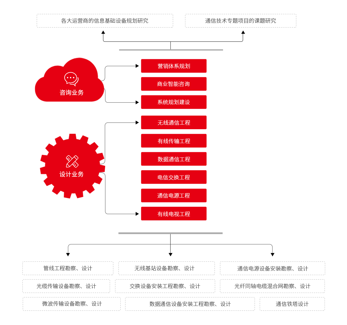 为客户提供通信网、计算机网、广播电视网等网络的设计咨询服务;为通信企业提供综合发展规划、战略规划 专题规划、业务咨询及管理咨询等咨询服务。公司拥有工程设计、工程勘察等国内通信设计领域的顶级资质;优质的服务质量,快速的业务响应能力、标准化、规范化的服务流程以及优秀的工程设计项目质量为公司在业界取得良好的口碑。